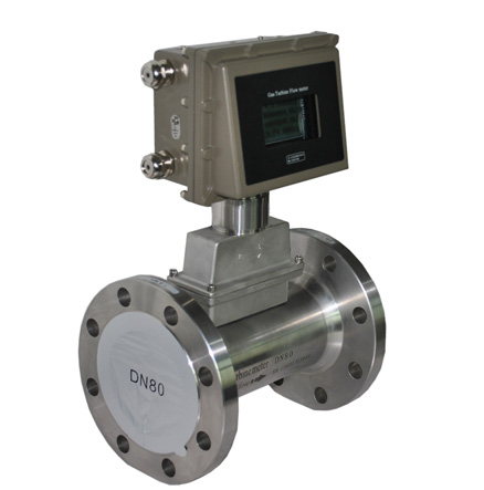 当流体流入流量计时,在进气口专用一体化整流器的作用下得到整流并加速,由于涡轮叶片与流体流向成一定角度,此时涡轮产生转动力矩,在克服摩擦力矩和流体阻力矩后,涡轮开始旋转。在一定的流量范围内,涡轮旋转的角速度与流体体积流量成正比。根据电磁感应原理,利用磁敏传感器从同轴转动的信号轮上感应出与流体体积流量成正比的脉冲信号,该信号经放大、滤波、整形后与温度、压力传感器信号一起进入智能流量积算仪的微处理单元进行运算处理,并把气体的体积流量和总量直接显示于LCD屏上。