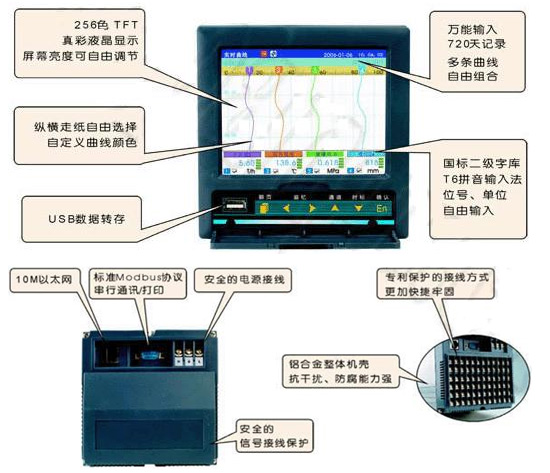 彩屏无纸记录仪,可输入标准电流、标准电压、频率、毫伏、热电偶、热电阻等信号。具有传感器隔离配电输出、继电器报警输出、变送输出、流量积算、温压补偿、历史数据转存、打印以及远程通讯功能。