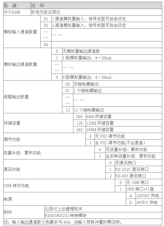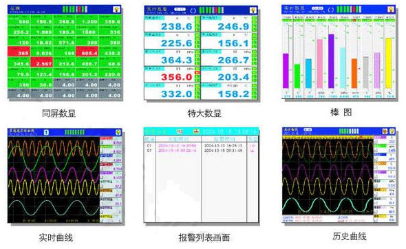 中长图彩屏无纸记录仪,40路万能输入,可输入标准电流、标准电压、频率、毫伏、热电偶、热电阻等信号。具有传感器隔离配电输出、继电器报警输出、变送输出、流量积算、温压补偿、历史数据转存、打印以及远程通讯功能。