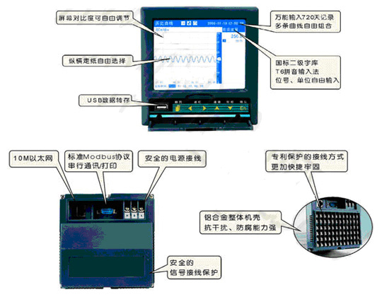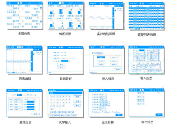 蓝屏无纸记录仪,可输入标准电流、标准电压、频率、毫伏、热电偶、热电阻等信号。具有传感器隔离配电输出、继电器报警输出、变送输出、流量积算、温压补偿、历史数据转存、打印以及远程通讯功能。