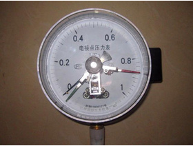 仪表的工作原理是基于测量系统中的弹簧管在被测介质的压力作用下,迫使弹簧管之末端产生相应的弹性变形——位移,借助拉杆经齿轮传动机构的传动并予放大,由固定于齿轮轴上的指示指针(连同触头)逐将被测值在度盘上指示出来。与此同时,当其与设定指针上的触头(上限或下限)相接触(动断或动合)的瞬时,致使控制系统中的电路得以断开或接通,以达到自动控制和发信报警的目的。